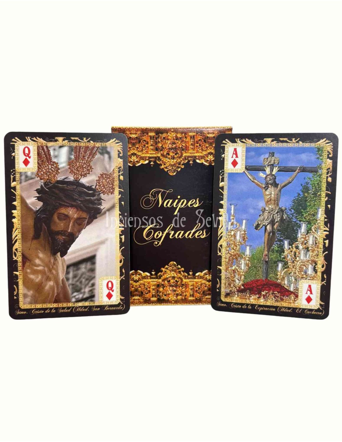 “Naipes Cofrades” es una baraja temática dedicada a la Semana Santa sevillana. Combina la estructura tradicional de los naipes con imágenes religiosas de gran valor artístico y devocional, convirtiéndose tanto en un juego funcional como en un objeto de colección para cofrades y amantes de la tradición.
